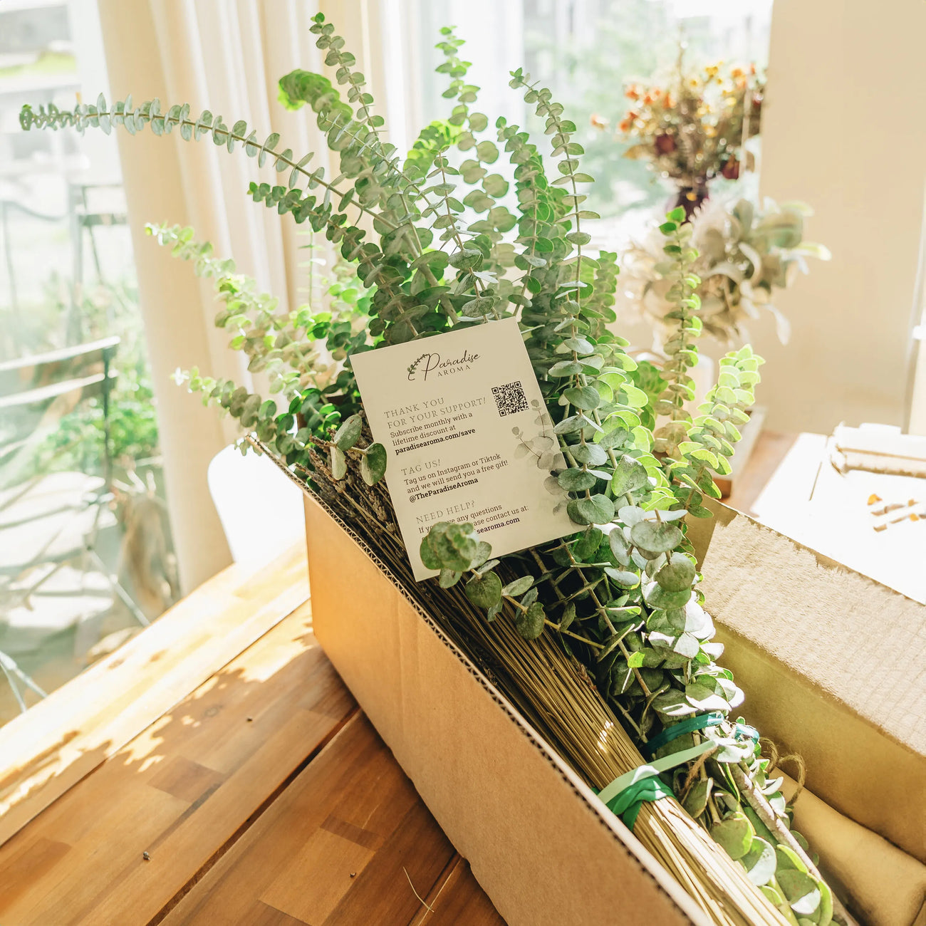 Every Paradise Aroma bundle is real, fresh-cut eucalyptus. The kind with moisture still in the stems. The kind you can smell before you even open the box.